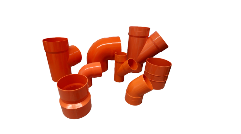 Our PVC fittings for building comply with UNI EN 1329 standard. They are designed for maximum compatibility and strength, ensuring safe and long-lasting installations in every application. Available colors: Orange RAL 2008, Grey RAL 7037, Ivory RAL 9001. Production range: from Ø 32 to Ø 400.